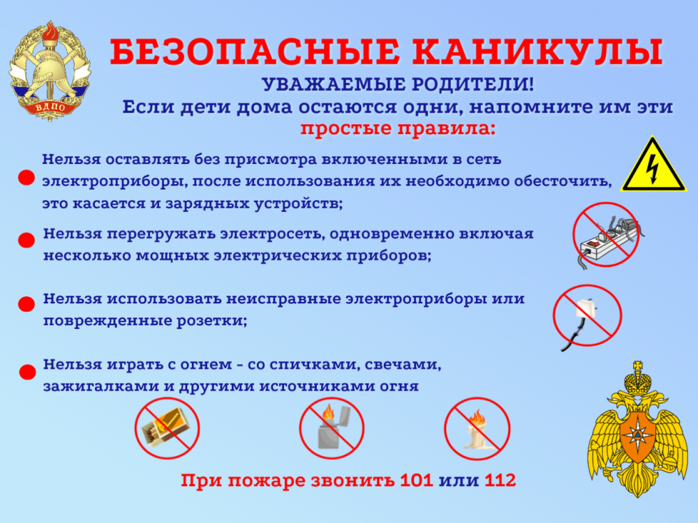 Уважаемые родители! Если ваши дети дома будут одни на каникулах, напомните им основные правила пожарной безопасности!