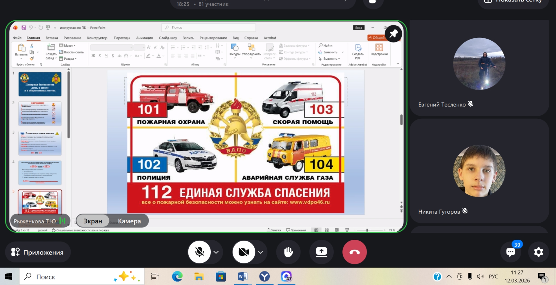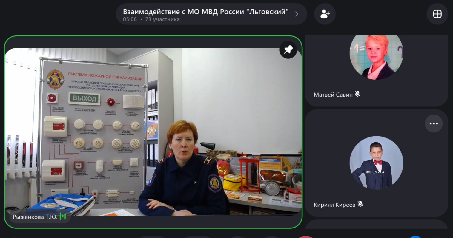 В рамках сетевого взаимодействия сотрудники Курского областного отделения ВДПО провели онлайн-встречу с обучающимися 6-7 классов МБОУ «СОШ №4 г. Льгова» на тему: «Пожарная безопасность в школе, дома и в общественных местах».